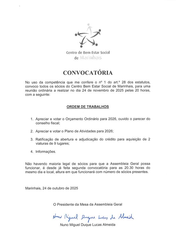 No próximo dia 24 de novembro de 2025 terá lugar a Assembleia Geral do Centro de Bem Estar Social de Marinhais com a seguinte ordem de trabalhos: